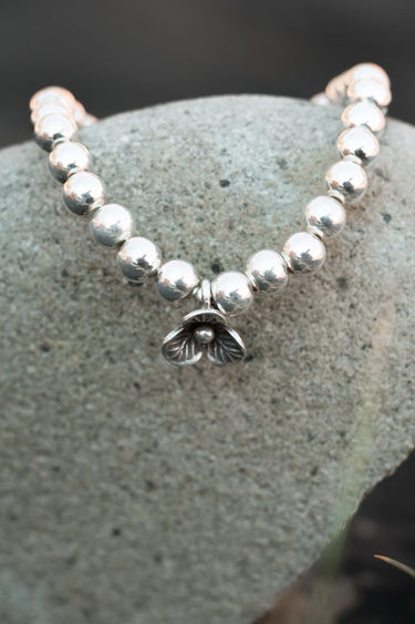 Karen Hill Tribe flower charms. This bracelet is made with 6mm sterling silver beads on high quality stretch cord