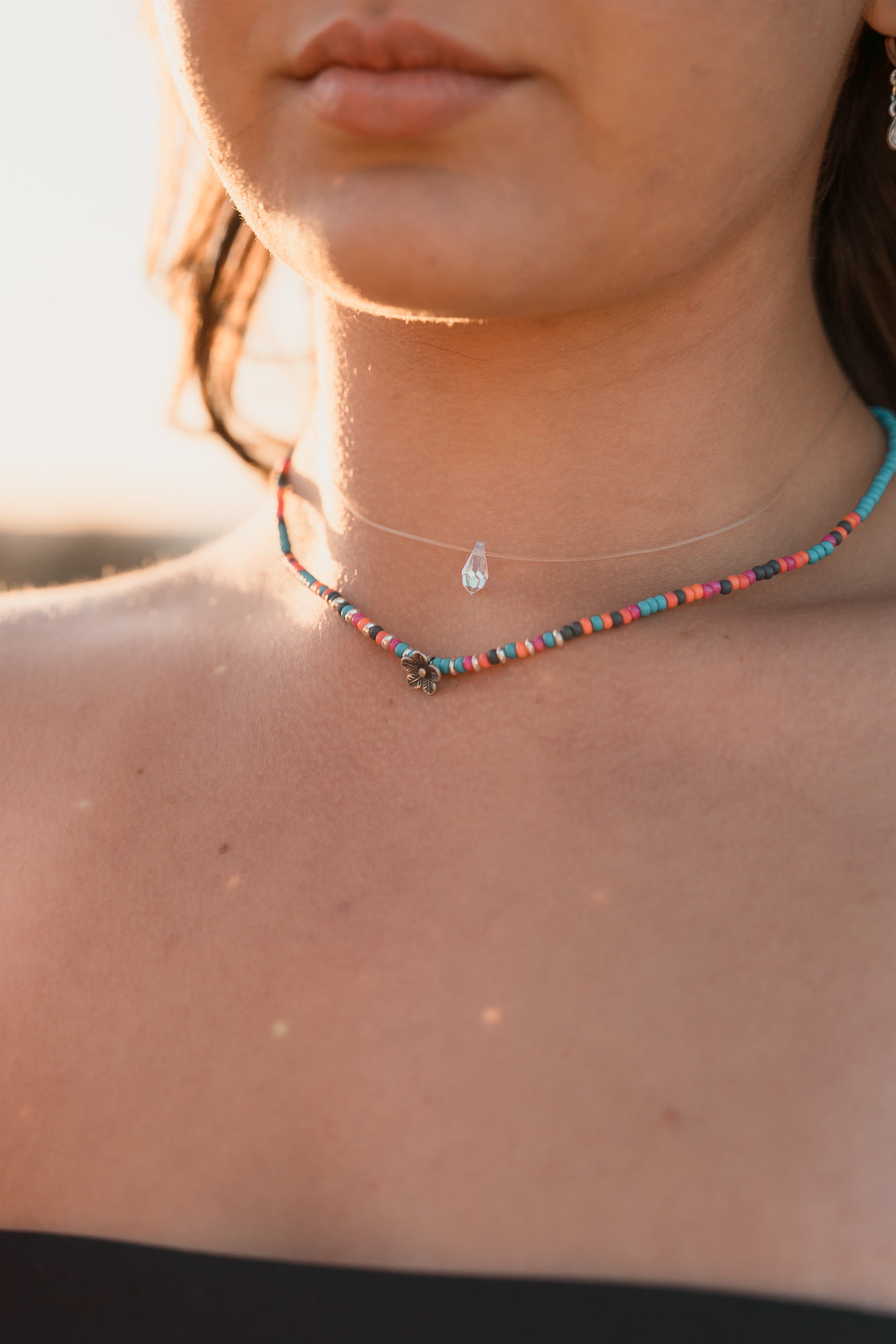 Choker style preciosa beaded necklace with Hill Tribe flower charm on high quality stretch cord