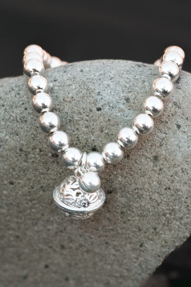 Hollow bell charms(16mm x14mm and 6mm).The bracelet is made with 6mm sterling silver beads on high quality stretch cord