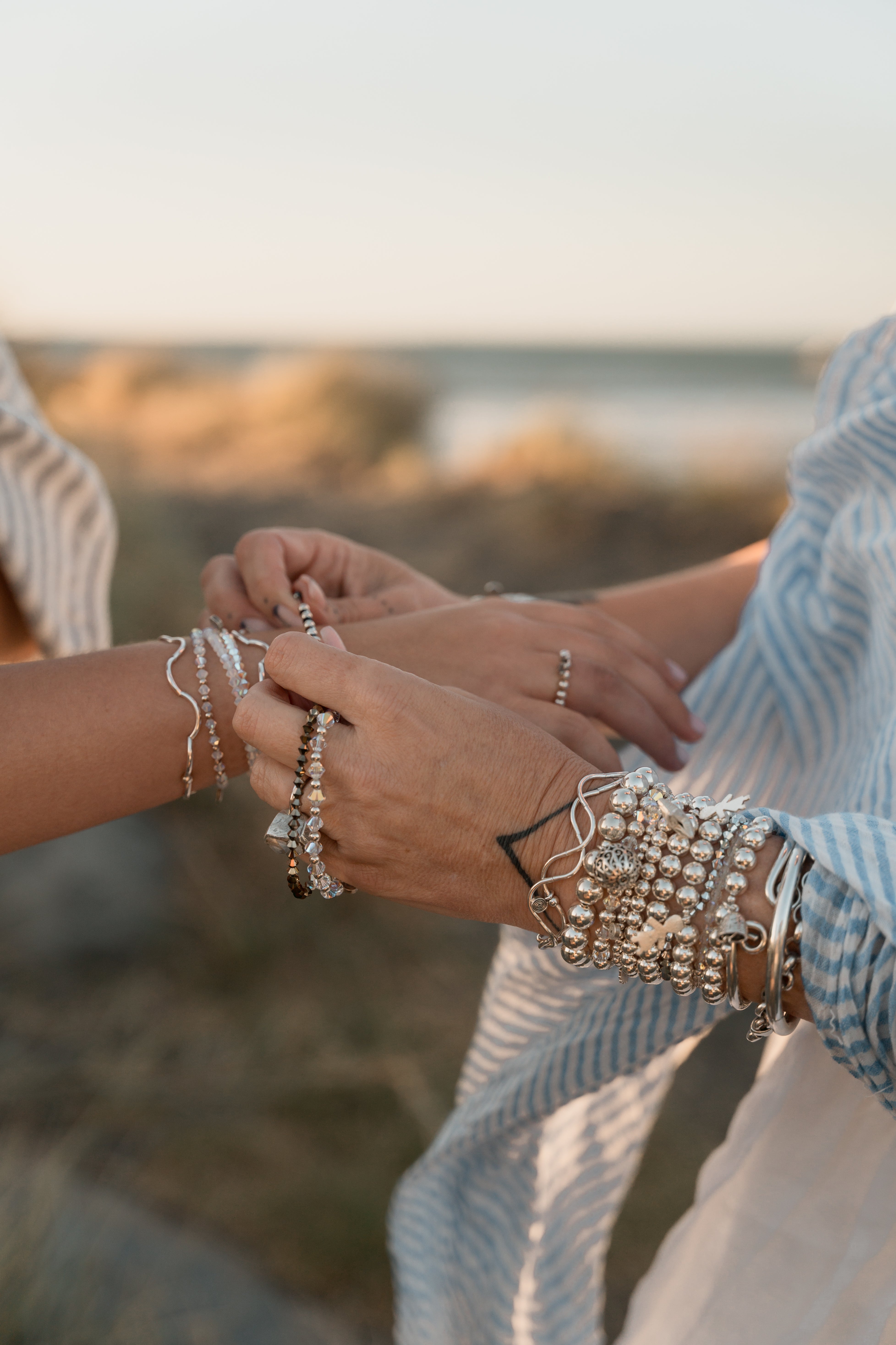 - Exposure to cleaning agents, lotions, hot water, salt water, chlorine, cosmetics and perfumes may tarnish silver, affect the crystals and perish the elastic.