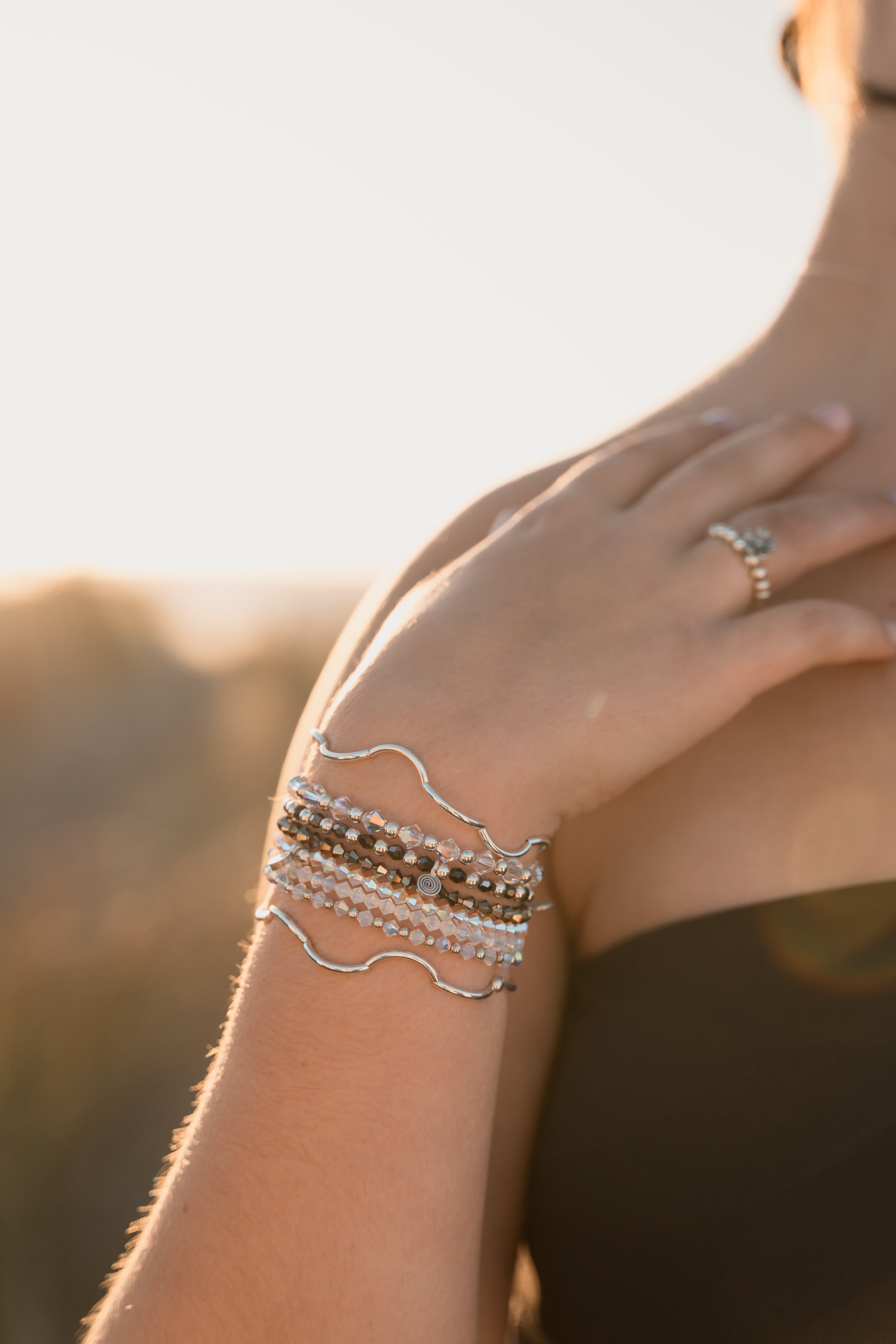 - Exposure to cleaning agents, lotions, hot water, salt water, chlorine, cosmetics and perfumes may tarnish silver, affect the crystals and perish the elastic.